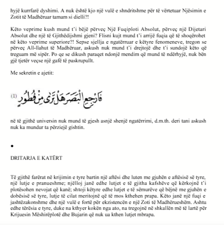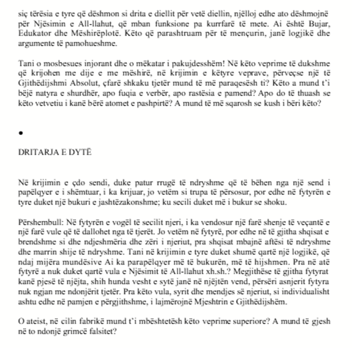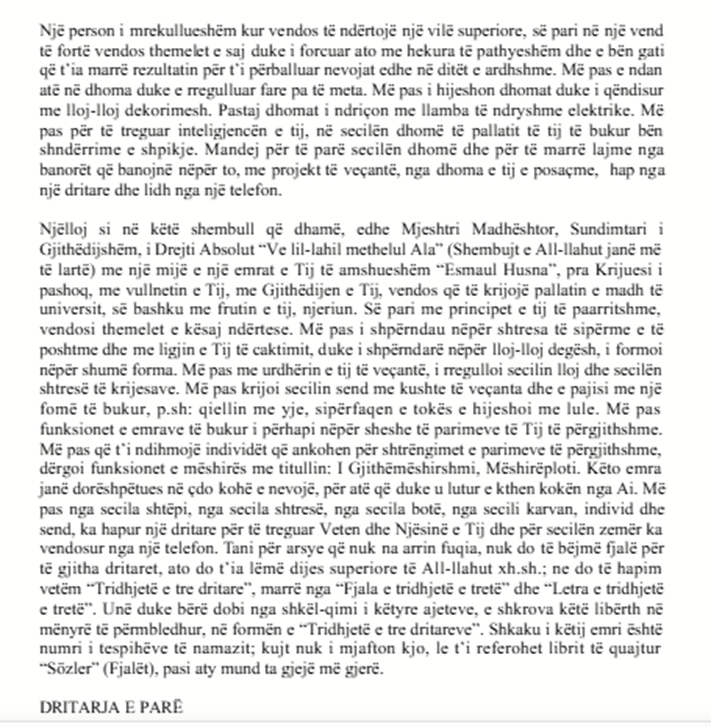 کلام های کوتاه Küçük Sözler بِسْمِ اللّٰهِ الرَّحْمٰنِ الرَّحِيمِ وَ بِهِ نَسْتَعِينُ اَلْحَمْدُ لِلّٰهِ رَبِّ الْعَالَمِينَ وَ الصَّلاَةُ وَ السَّلاَمُ عَلَى سَيِّدِنَا مُحَمَّدٍ وَ عَلَى آلِهِ وَ صَحْبِهِ اَجْمَعِينَ بِسْمِ اللّٰهِ الرَّحْمٰنِ الرَّحِيمِ وَ بِهِ نَسْتَعِينُ اَلْحَمْدُ لِلّٰهِ رَبِّ الْعَالَمِينَ وَ الصَّلاَةُ وَ السَّلاَمُ عَلَى سَيِّدِنَا مُحَمَّدٍ وَ عَلَى آلِهِ وَ صَحْبِهِ اَجْمَعِينَ ای برادر! از من چند نصیحت خواسته بودی Ey kardeş! Benden birkaç nasihat istedin. چون تو سرباز هستی، بنابراين چند حقیقت را ضمن مثالهای نظامی و هشت حکایت کوتاه بیان کردهام، تو نیز همراه با نفسم به آن گوش فرا ده، Sen bir asker olduğun için askerlik temsilatıyla, sekiz hikâyecikler ile birkaç hakikati nefsimle beraber dinle. زیرا نفسم را زیادتر از هرکس دیگری به نصیحت محتاج میبینم. زمانی از هشت آیه استفاده کردم، و هشت گفتار را کمی طولانی به نفسم گفته بودم Çünkü ben nefsimi herkesten ziyade nasihate muhtaç görüyorum.Vaktiyle sekiz âyetten istifade ettiğim sekiz sözü biraz uzunca nefsime demiştim. اکنون کوتاه و با زبانی عامیانه به نفسم خواهم گفت، هرکس میخواهد، همراه با ما گوش فرا دهد. Şimdi kısaca ve avam lisanıyla nefsime diyeceğim. Kim isterse beraber dinlesin. کلام اوّل Birinci Söz بِسْمِ اللّه ابتدای هر خیریست. ما نیز ابتدا، با آن شروع میکنیم Bismillah her hayrın başıdır. Biz dahi başta ona başlarız. بدان ای نفسم! که این کلمهی مبارک، هم نشانه اسلام است، و هم تمام موجودات با زبان حال خود، آن را ورد زبان دارند Bil ey nefsim, şu mübarek kelime İslâm nişanı olduğu gibi bütün mevcudatın lisan-ı haliyle vird-i zebanıdır. Bismillah ne büyük tükenmez bir kuvvet, ne çok bitmez bir bereket olduğunu anlamak istersen şu temsilî hikâyeciğe bak, dinle. شخصی که در بیابانهای عرب بدوی سیاحت میکند، لازم است، اسم رییس قبیلهیی را بگیرد، و تحت حمایتش قرار گیرد، تا از شَر راهزنان نجات پیدا کرده، و بتواند حاجاتش را مهیّا نمايد Şöyle ki: Bedevî Arap çöllerinde seyahat eden adama gerektir ki bir kabile reisinin ismini alsın ve himayesine girsin, tâ şakîlerin şerrinden kurtulup hâcatını tedarik edebilsin. #2 در غیر این صورت تک و تنها در برابر احتیاجات و دشمنان بیشمارش پریشان خواهد شد. Yoksa tek başıyla hadsiz düşman ve ihtiyacatına karşı perişan olacaktır. اینک دو نفر، برای چنین سیاحتی به صحرایی رفته، و به راه میافتند، İşte böyle bir seyahat için iki adam sahraya çıkıp gidiyorlar. یکی از آنها متواضع بود، و دیگری مغرور Onlardan birisi mütevazi idi, diğeri mağrur. متواضع، اسم رییسی را گرفت، و مغرور ابا ورزید.. Mütevazii, bir reisin ismini aldı. Mağrur, almadı. متواضع، به واسطه آن نامی که گرفته بود، همه جا را در سلامت کامل سیاحت کرد، Alanı, her yerde selâmetle gezdi. و در حین سیاحت اگر اتفاقی به راهزنی برخورد میکرد، میگفت: "من به نام فلان رییس سیاحت میکنم." و راهزن دفع شده، کاری با او نداشت Bir katıu’t-tarîke rast gelse der: “Ben, filan reisin ismiyle gezerim.” Şakî def’olur, ilişemez. یی وارد میشد، به خاطر آن نام حرمت میدید. اگر هم به خیمه Bir çadıra girse o nam ile hürmet görür. ولی دیگری که مغرور بود، در مدت سیاحتش بلاهایی کشید، که قابل گفتن نيست Öteki mağrur, bütün seyahatinde öyle belalar çeker ki tarif edilmez. دایم میلرزید، و مدام درحال گدایی کردن بود، Daima titrer, daima dilencilik ederdi. هم ذلیل و هم رسوا شد Hem zelil hem rezil oldu. بدان! که تو آن سیّاحی و این دنیا هم یک صحراست. اکنون ای نفسِ مغرورم İşte ey mağrur nefsim, sen o seyyahsın. Şu dünya ise bir çöldür. عجز و فقرت بی شمار Aczin ve fakrın hadsizdir. دشمنان و حاجاتت بینهایت است Düşmanın, hâcatın nihayetsizdir. و حال که چنین است، اسم مالک ابدی و حاکم ازلی این صحرا را بگیر Madem öyledir, şu sahranın Mâlik-i Ebedî’si ve Hâkim-i Ezelî’sinin ismini al. تا از گدایی تمام کاینات و از لرزیدن در برابر هر حادثهیی رهایی یابی. Tâ bütün kâinatın dilenciliğinden ve her hâdisatın karşısında titremeden kurtulasın. آری، این کلمه، چنان گنج پر برکتیست، که Evet, bu kelime öyle mübarek bir definedir ki عجز و فقر بینهایتت را به رحمت و قدرت بینهایتی ربط داده، و عجز و فقر را برایت در درگاه رحیم قدیر مقبولترین شفاعتکننده خواهد کرد. senin nihayetsiz aczin ve fakrın, seni nihayetsiz kudrete, rahmete rabtedip Kadîr-i Rahîm’in dergâhında aczi, fakrı en makbul bir şefaatçi yapar. آری کسی که با این کلمه